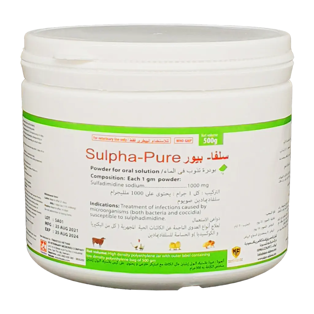 سلفا- بيور لعلاج أنواع العدوي الناجمة عن الكائنات الحية المجهرية كل من البكتيريا و الكوكسيديا الحساسة للسلفاديمادين.