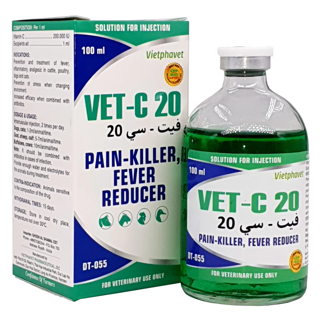 فيت- سي 20 هو محلول حقن يحتوي على فيتامين سي بيطري للمواشي والحيوانات الأليفة ليساعد في علاج الحمى والألم والالتهابات، كما يساعد في تخفيف الإجهاد ويعزز فعالية المضادات الحيوية عند استخدامه معها.
