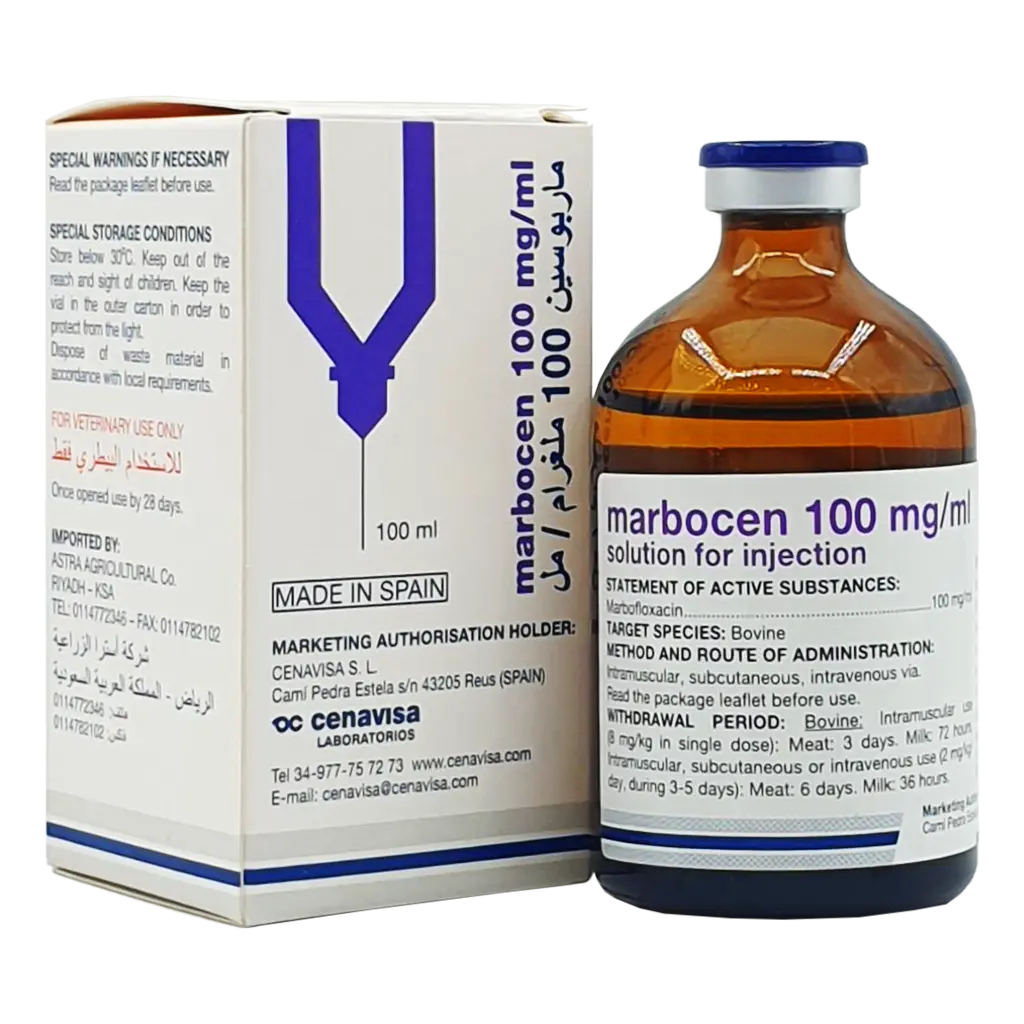 ماربوسين هو مضاد حيوي بيطري المادة الفعالة فيه هي ماربوفلوكساسين ومعنى ذلك أنه فعال ضد نطاق واسع من البكتيريا التي تسبب الأمراض التنفسية للأبقار مما يجعله مناسب للاستعمال كـ مضاد حيوي تنفسي بيطري، وليس ذلك فحسب!